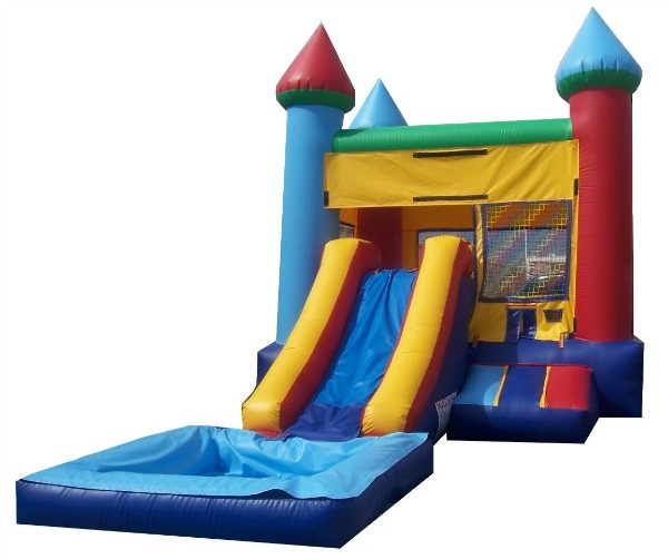 These Units are a 3 in 1 Combo with an attached pool and mister for the slide. We attach your garden hose to our mister and the slide stays wet throughout your event. It is equipped with a basketball hoop inside, a climbing wall and a slide for hours of fun!